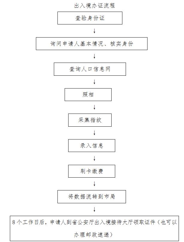 1、查验身份证;2、询问申请人基本情况、核实身份;3、查询人口信息网;4、照相;5、采集指纹;6、录入信息;7、刷卡缴费;8、将数据流转到市局;9、8个工作日后,申请人到省公安厅出入境接待大厅领取证件(也可以办理邮政速递)。