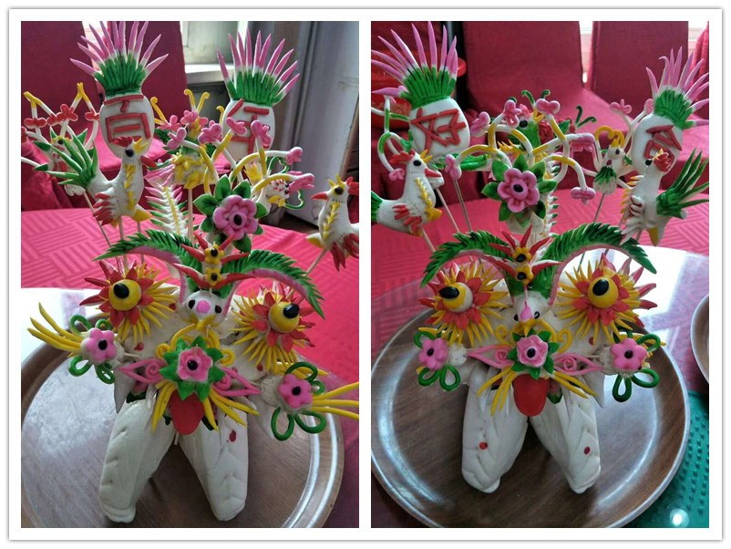 乍一看以为这两个花馍一模一样,仔细一瞧原来是“百年”和“好合”